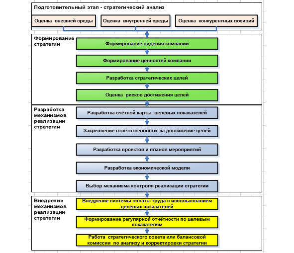В литературе выделяется от 3-х до 8-ми этапов стратегического планирования. У меня укрупнёно получилось 4 этапа с детализацией каждого.