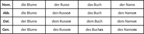 Как видите, у всех существительных, кроме die Blume, при склонении появились окончания. У слов der Russe и der Name эти окончания стоят во всех падежах, кроме именительного. У das Buch только в Genitiv.