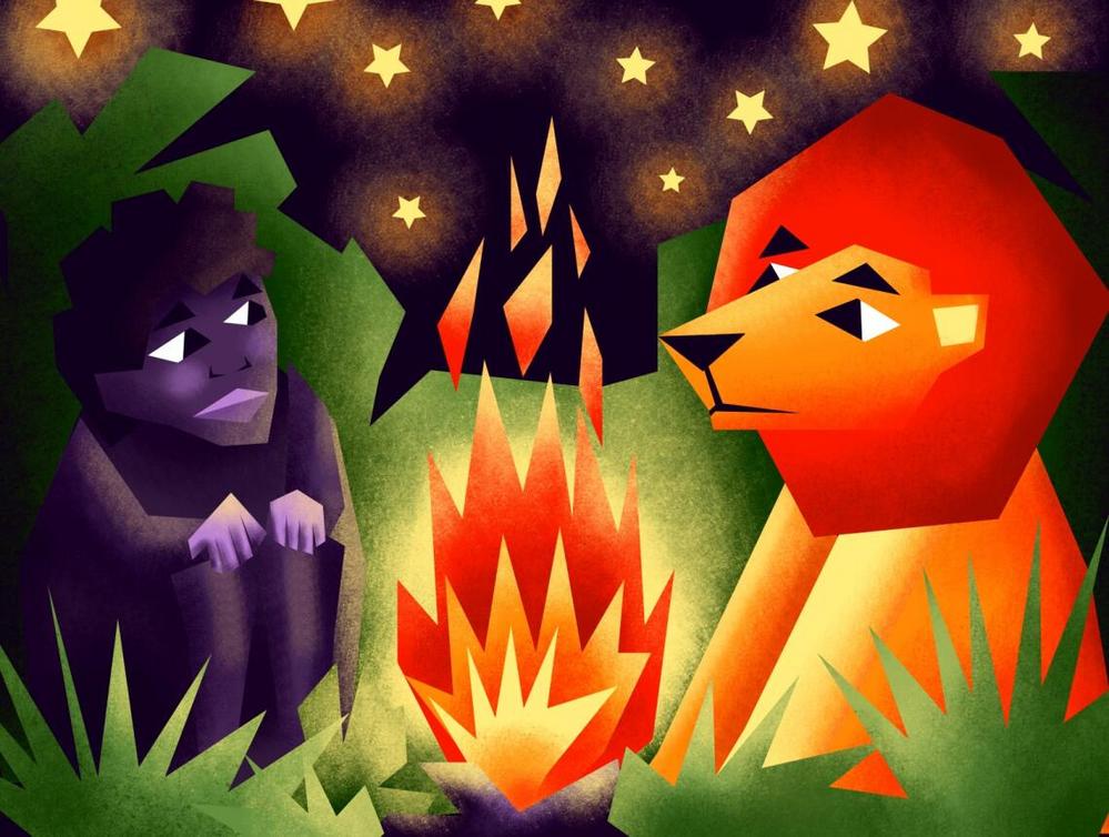 На листьях сверху играл еще не потухший костёрИ тут я услышал его мягкие шаги. Он идёт бесшумно, но я то научился его слышать издалека. Я знал, он идет ко мне. Я как друга ждал его. И вот он вышел в свет от огня. Было поразительно, но он не боялся этого обжигающего пламени, он как будто купался в оранжевом свете. Я присматривался к нему и решил спуститься, чтобы увидеть поближе. Мы сидели напротив друг друга по разные стороны костра. Я смотрел на его густую гриву, в этом свете она выглядела как языки огня. У него были большие лапы, крепкая мускулатура, он был величественный. Он смотрел прямо мне в глаза. Мне захотелось подойти к нему, ведь он свои шаги навстречу сделал и он ждал, я знаю. Я подошел и сел рядом, мы переглянулись. Я не боялся. Моя рука потянулась к нему и погладила его по мягкой шерсти, рука тонула в гриве. Мы сидели так долго. Я знал, он поможет мне в пути. Этот могущественный зверь проведет меня сквозь джунгли, нам вдвоем не страшно ни что, всё покорится этому союзу. Я открыл глаза. Первые лучи солнца уже пытались пробиться сквозь листву и немного освещали полянку. Пора вставать и идти навстречу миру! Но я всё лежал и думал о том, что мне снилось. Чувство родства душ не покидало меня. Прекрасный сон, он вселял в меня уверенность. Что это было? Хранитель? Мой предок? Душа джунглей? Не важно, я знал, он теперь со мной, он будет меня сопровождать.