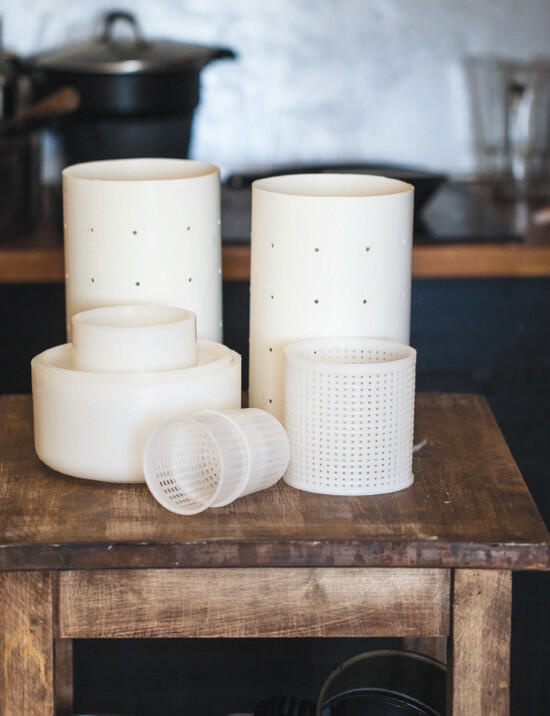 ФОРМЫ ДЛЯ ПРЕССОВАНИЯ СЫРА. В зависимости от вида сыра следует подбирать и форму для его приготовления. Например, для камамбера и других самопрессующихся сыров подойдут высокие формы маленького диаметра. Нужны именно высокие, так как сырная масса сильно оседает в процессе выстаивания: положив, к примеру, 15 см сырного зерна в форму, вы получите головку камамбера высотой всего 4-5 см. Такие формы можно либо купить в лавке для сыроделов (найдите в интернете), либо сделать самостоятельно, отпилив кусок ПВХ трубы и просверлив в нем большое количество отверстий для стекания сыворотки. Чтобы приготовить сыры с полутвердой или твердой структурой (такие как чеддер, грюйер, грана падано), лучше использовать формы заводского производства: они имеют в комплекте специальную крышку. Ну а если очень хочется порукодельничать, то смело сверлите старую кастрюлю, уменьшайте диаметр ее крышки, чтобы она свободно входила внутрь, и пользуйтесь с удовольствием. Свою первую форму для сыра я смастерил именно таким образом, и она служит мне до сих пор.