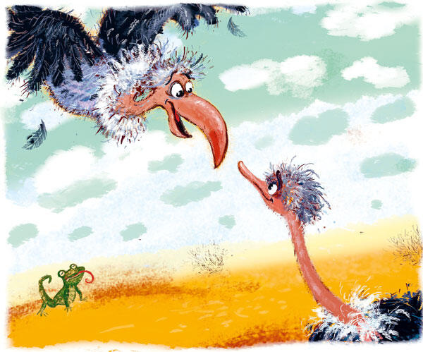 Гриф стремительно прилетел откуда-то с дальних гор. Страус тут же голову в песок сунул по трусливой привычке.