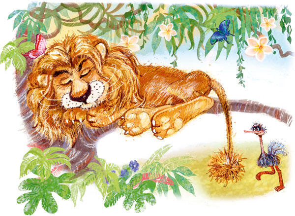 А хвост у Льва, как назло, свисал над тропинкой. Вот и задел его случайно проходивший мимо Страус.
