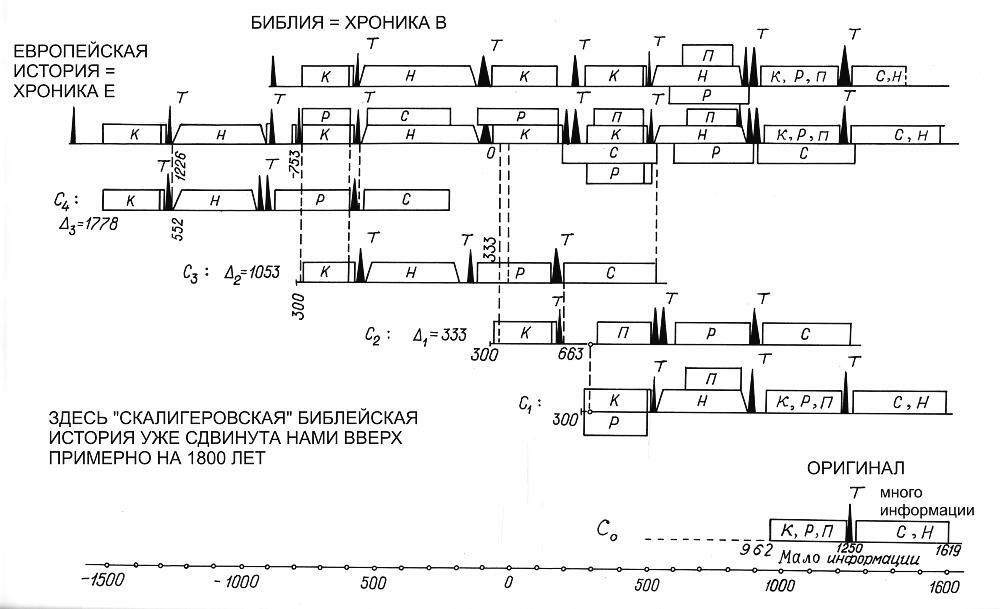 Оказалось, что «скалигеровский учебник» Е по древней и средневековой истории Европы является слоистой летописью, которую средневековые хронологи изготовили склейкой четырех практически одинаковых экземпляров короткой летописи C1. То есть, три летописи C2, C3, C4 получаются из летописи C1 ее сдвигом, как жесткого целого, вниз во времени, на 333 года, 1053 года и 1778 лет соответственно. Указанные величины сдвигов, конечно, приблизительны.