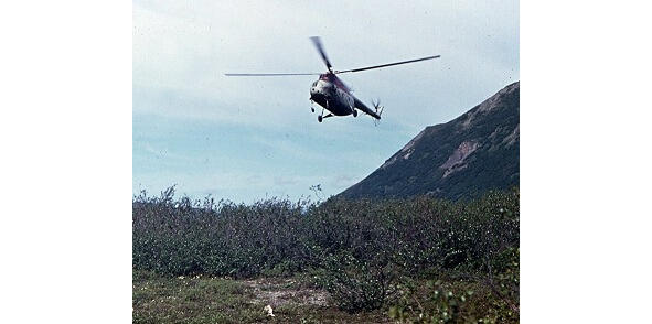 Здесь же на косе в сторонке садился и вертолет МИ-4.