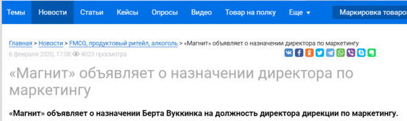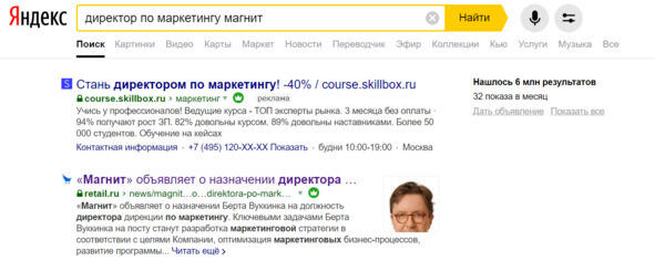 Простой запрос в «Яндексе» выдаёт ссылку на статью о назначении директора по маркетингу.