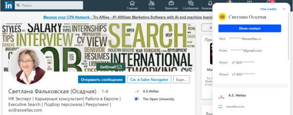 Расширение Lusha для браузера позволяет вытягивать данные из профиля LinkedIn без добавления человека в друзья. Информация берётся из открытых источников. Там может быть или телефон, или почта, или и то и другое, а может и ничего не быть. Если система ничего не нашла, можно перейти ко второй стратегии.