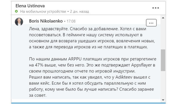 Например, когда я продавал руководителям отдела перформанс маркетинга внутри ретейловых компаний, то, даже зная их имена, всегда старался сначала зайти к e-commerce директорам, чтобы получить от них контакт уже известного мне руководителя. Было понятно, что рекомендация начальства усилит желание сотрудника со мной пообщаться.