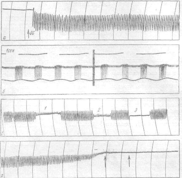 Рис. 2. Устойчивые автоколебания и п. с. р.:а возникновение автоколебаний; о.с. момент включения обратной связи. Запись на Н-373 в течение 100 сек. б возникновение автоколебаний. Запись на Н-102. Нижний луч колебания растяжения мышцы, средний импульсная активность.в ограничение автоколебаний:1 ограничение растяжения мышцы с одной стороны,2 с двух сторон,3 искусственная остановка. Устранение ограничений приводит к восстановлению амплитуды автоколебаний. Запись на Н-373. г поиск стационарного режима (п.с.р.). Запись на Н-373. Последняя стадия процесса. Стрелки соответствуют моментам начала записей на Н-102