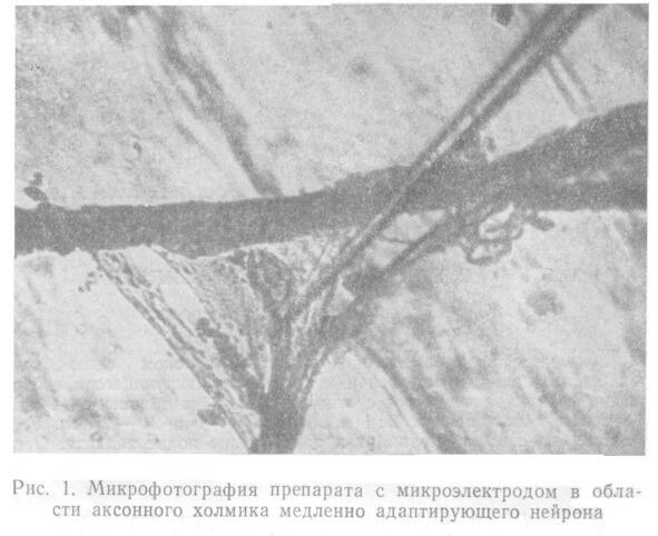 Микроэлектрод подводили с помощью микроманипулятора ММ-1 к избранной точке нейрона под контролем микроскопа МБР-1 (рис.1). В качестве источника раздражающего тока использовался генератор Г347.