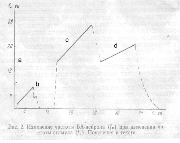 На рис. 2 показано изменение частоты БА-нейрона (fH) при изменении частоты стимула (fc); амплитуда раздражения 11 в. Микроэлектрод расположен вблизи АХ.