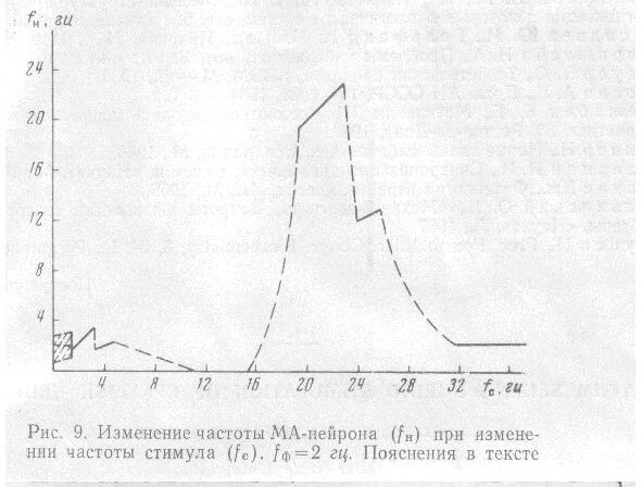 Вхождение в эту область предваряется участком вероятностной реакции, которая может быть обнаружена и при переходе от режима 1:1 к 2:1 и затем после последнего (на рис.9. в интервалах 2324 и 2632 гц соответственно). При частотах выше 32 гц не удается обнаружить воздействие стимула данной амплитуды на импульсную активность МА, нейрон возвращается к исходной фоновой активности.