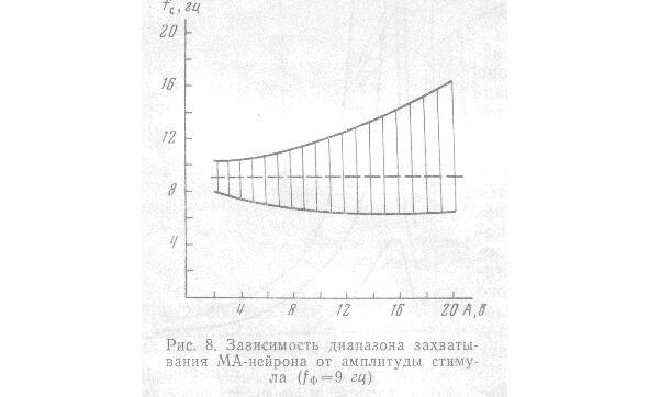 Ширина этого диапазона ЗЧ и значения его граничных частот зависят как от фоновой частоты работы нейрона fф, так и от амплитуды стимула. С увеличением fф диапазон захватывания расширяется. Зависимость этого диапазона от амплитуды стимула при fф = 9 гц представлена на рис. 8.