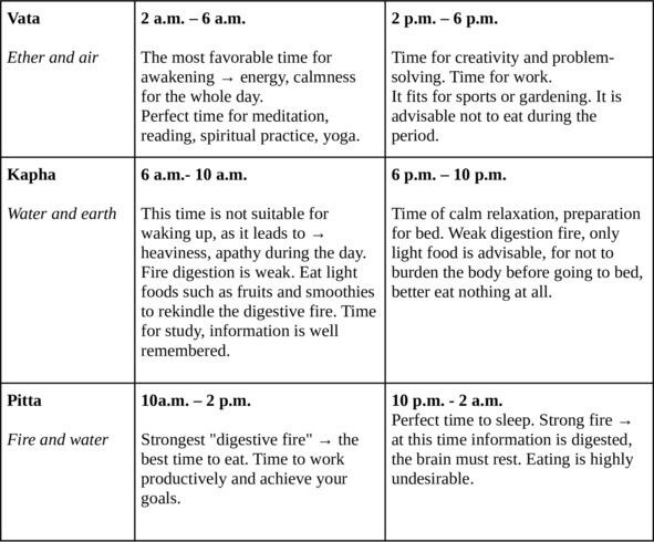 Doshas influence us constantly as they change every four hours, throughout 24 hours a day. Every four hours, one dosha prevails and affects the general condition. In other words, there are times of vata, pitta and kapha, both during the day and night. Understanding this allows you to choose activities, food, which maintains the dominant energy in and around you at this time.