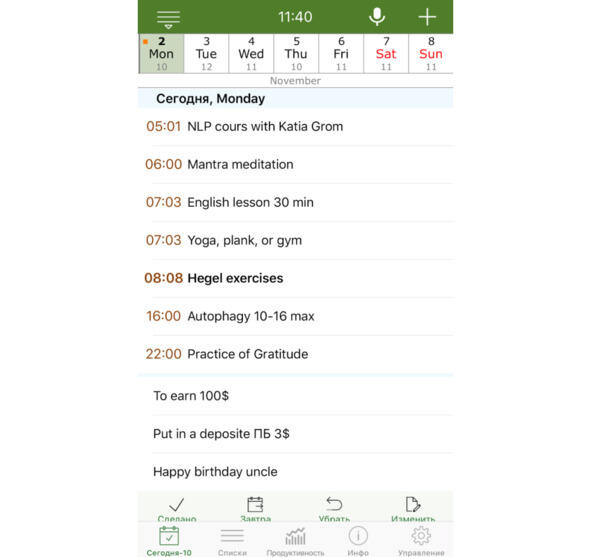 For many years, I have been using the My Time app on my mobile with a simple and user-friendly interface: I write the name of the task, select the time and date, save and that is it. In the evening, I write tasks for the next day. During the day, when the task is completed, I mark it. Here, I write my daily rituals such as meditation, sports, etc. Below is a screenshot of my application.