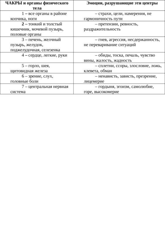 На каждой из частот существует свой центр (чакра), который отвечает за нормальную работу органов на этом уровне; принимает энергию определенных эмоций и гармонизирует действия человека в социальной среде; отвечает за определенные взаимодействия человека и социальной среды. Это вы прочитаете в главе «Кто же мы такие?» в разделе «Физическое тело». Эмоции, данные в таблице, показывают, какой центр они разрушают. А значит, и органы, которые обслуживает это центр.