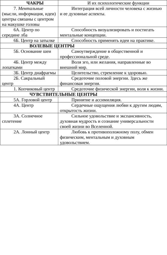 В таблице показано: 1) местонахождения центров на физическом теле и 2) за какие качества или проявления в социальной и духовной среде они отвечают. Первая и седьмая чакра не парные, а чакры со второй по шестую парные. Передняя часть энергоцентров отвечает за нашу чувствительность, за внутренний мир, а задняя за волевые проявления во внешней среде (тогда как в таблице 6 показаны еще и органы, которые обслуживаются каждым центром).