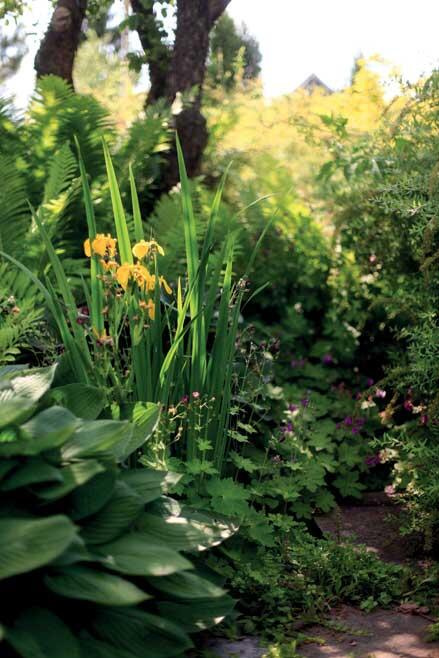 Хоста, ирис болотный, герань крупнокорневищная, на заднем плане страусник