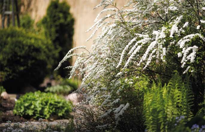 Спирея серая Грефшайм, страусник, вдалеке герань темная