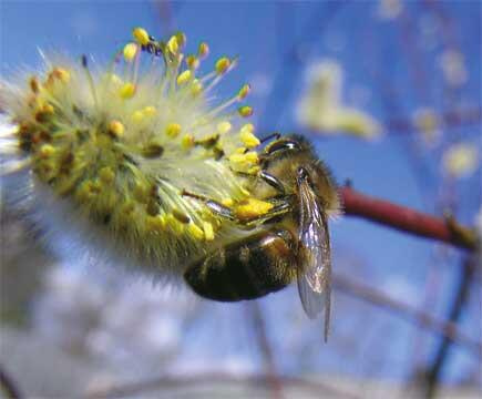 Еще заморозки по ночам, еще не слишком тепло днем, но верба первой отдает свои нектар и пыльцу пчелам