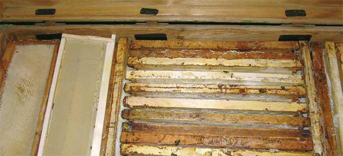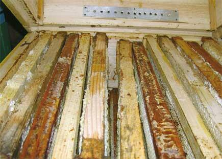 Оттого начинающему пчеловоду надо научиться оберегать и новые и старые соты от моли и мышей. Используйте для этого специальные герметичные ящики, для надежности обитые жестью или очень тонким металлом. Если в них не хватает места, сушь можно разместить в свободных ульях и магазинных надставках. Основное требование закрытые летки, плотное прилегание деревянных частей друг к другу и полное отсутствие щелей, сквозь которые могут проникнуть грызуны. Такие ульи желательно обвязать еловыми ветками. Нельзя размещать сотохранилище в том же самом помещении, где зимуют пчелы. Из-за влажности воздуха соты могут покрыться плесенью, а имеющаяся в них перга испортится.