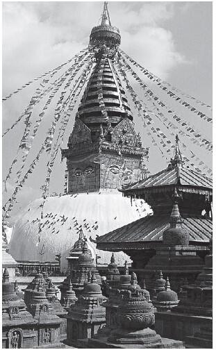 В Катманду было чем заняться, было что посмотреть и узнать. Но местом, которое особенно нас привлекало, был холм Сваямбху с храмом на вершине, почти за городом. Направляясь туда по кратчайшей дороге, проезжаешь груды черепов животных, недавно забитых на бойне, и своры собак самых откормленных в долине, но все же агрессивных. В этом районе грязно, и мы не задерживались у чайных, где воду для чая берут, наверное, из местной реки. Но ни эти неприятности, ни внеземные прелести города не могли остановить нас. Снова и снова мы возвращались туда, притягиваемые магическим холмом.