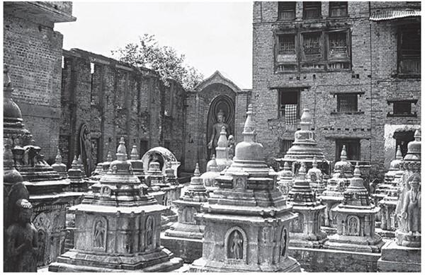 Вокруг купола кольцом расположен двор. Посетители, читая мантры, обходят центральное строение по часовой стрелке, и те из них, кому молитвенные колеса не кажутся слишком засаленными, приводят их в движение усилием рук. За несколькими кирпичными зданиями виден серо-белый тибетский монастырь с величественным центральным входом, ведущим к алтарю.