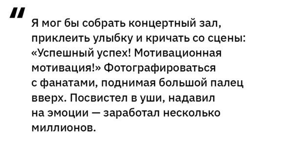 Я мог бы собрать концертный зал, приклеить улыбку и кричать со сцены: «Успешный успех! Мотивационная мотивация!» Фотографироваться с фанатами, поднимая большой палец вверх. Посвистел в уши, надавил на эмоции заработал несколько миллионов. Но так не пойдет. Давайте лучше я расскажу вам правду без шаблонных фраз и красивых ключей к успеху.