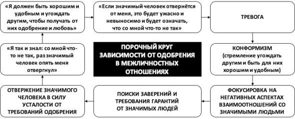 Если вы зависимы от чужого одобрения, то часто испытываете тревогу из-за катастрофических мыслей о возможной критике и последующем отвержении важных для вас людей, полагая, что отвержение это ужасно и невыносимо и к тому же означает, что с вами что-то не так. В силу этих верований вы стараетесь быть хорошим и удобным для этих людей и всячески угождать им, чтобы получить заветную и «необходимую» для счастья дозу одобрения или любви, отказываясь от собственных интересов и потребностей. При этом вы тщательно следите за реакциями значимого человека, ища в них признаки отвержения, относите любое его неудовольствие на свой счёт и фокусируетесь сугубо на негативных аспектах ваших взаимоотношений, боясь упустить тот момент, когда вы перестанете соответствовать его ожиданиям, что станет причиной отвержения. В то же время вы игнорируете или обесцениваете позитивные реакции значимого другого, ведь они не гарантируют, что он рано или поздно не отвергнет вас, поэтому прибегаете к поискам заверений: «Всё же хорошо?», «Ты же меня любишь/ценишь/уважаешь?» и т. п. Такие навязчивые поиски заверений и требования гарантий могут привести к тому, что человек действительно отвергнет вас, но не потому, что с вами что-то не так, а всего лишь из-за того, что будет уставать от вашей ненасытной жажды получения одобрения и любви.