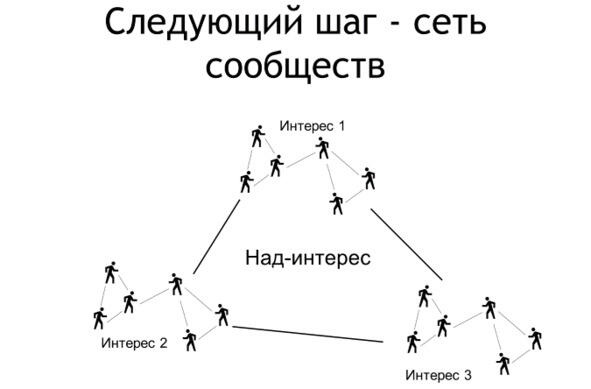 Последнее, что важно сказать. После сообщества следующий шаг это сеть сообществ (Рисунок 15). Они базируются на над-интересе. И каждое сообщество не теряет собственной идентичности, собственного культурного кода, сможет найти точки соприкосновения с другими сообществами. Чего я вам и желаю.