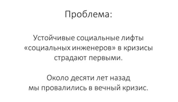 Особая проблема, которую важно не упустить из фокуса внимания, заключается в том, что в общественном развитии есть такая функция/страта/социальная группа социальный инженер те, кто преобразуют общественные состояния: устраивают новые формы взаимодействия, создают общественные институты и прочее. В кризисы появляется множество таких форм, а вот устойчивые социальные лифты для этих позиций разрушаются.
