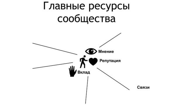 Итак, первый ресурс, с которым мы всё время работаем, но всё время забываем мнение. Если у человека нет своего мнения про наше общее дело, значит, ему неинтересно. И он вообще здесь как бы такой пассивный зритель. Сложить или сформировать мнение человека про наше общее дело, обсудить с ним это мнение, дальше в этом обсуждении выделить лидеров мнений, людей, которые обладают экспертизой, опытом и к их слову прислушиваются. Очень важно, чтобы у вас в сообществе постоянно шло вот такое кипение, в хорошем смысле слова коммуникация, складывались различные мнения. Опять же, это не то что мнений бывает два, моё и неправильное. Наоборот, сообщество тем хорошо, что оно максимально демократичное, помните про неформальное принятие решений, и там зарождаются и обсуждаются всевозможные мнения. Очень важно любого выслушать, даже если вы с ним не согласны, и какое-то зерно извлечь из его мнения.