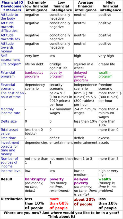 Financial intelligence is based on a financial program and a financial scenario based on a certain attitude towards money and financial expectations. Financial expectations can be completely different, and the attitude towards money can be negative, conditionally negative, neutral or positive. The financial scenario can be negative (financial dependence scenario), positive (financial security scenario), natural (financial independence scenario), and absolute (financial freedom scenario). Financial programs also four: this is a bankruptcy program (when a person spends more than he earns and lives in debt), a poverty program (when a person spends everything that he earns), a delayed poverty program (when a person spends everything that he earns, but not immediately) and a program wealth (when a person sets aside part of their income and creates investment capital).