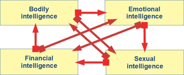 We will not touch upon bodily, emotional and sexual intelligence in this book. This is a topic for a separate book. We will only touch on financial intelligence. But keep in mind that it does not function by itself, but in active interaction with other parts of the intellect.