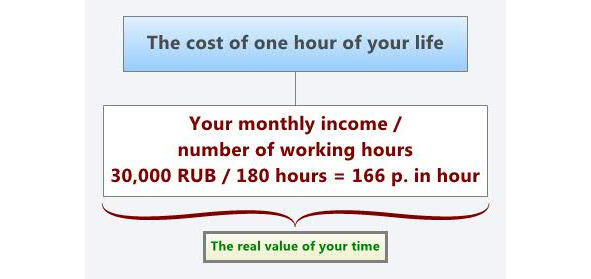 To determine how much one hour of your life is really worth, take your monthly income and divide it by the number of hours you spend working. If you work for an employee in a government organization, then this is usually the standard 170180 hours per month (provided that you live close to work and do not spend a lot of time traveling). If you work in a commercial structure or build your own business and devote more than 8 hours a day to work, then add the required number of hours to the standard working time, and then add to this amount the time you spend on the road to work and home, and then calculate the real cost of your time using the formula: