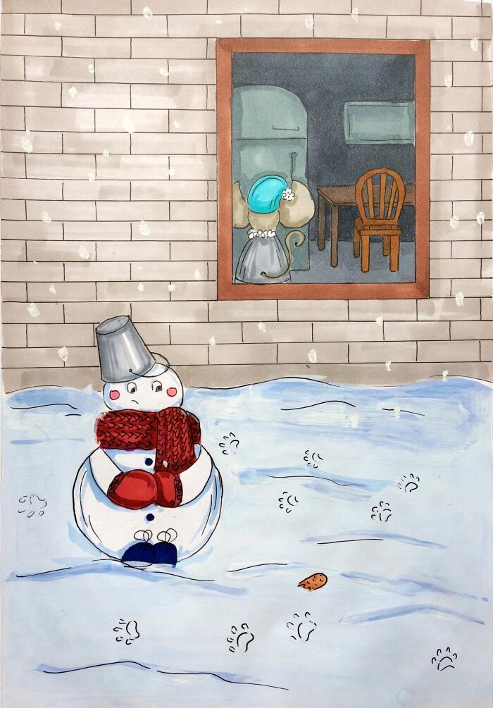 Прошло несколько минут, мышонок ничего не мог придумать. И тут неожиданно в коридоре загорелся свет. Дверь на кухню открылась, и яркое освещение на секунду ослепило Мусика. В следующую секунду он уже был под холодильником. К холодильнику подошла маленькая девочка и открыла дверцу. Мусик, не теряя времени, тут же запрыгнул внутрь. Морковь лежала внизу, он сразу же её увидел. Мусик схватил самую хорошую и собрался уже выбираться наружу, но тут вдруг девочка, достав бутылку сока, захлопнула дверцу прямо перед носом мышонка. Он перепуганно заметался из стороны в сторону. Как же так, всего доли секунды не хватило ему, чтобы выбраться из нутра этого тёмного и холодного монстра! Что, если всё так и закончится, и он вскоре замёрзнет здесь, а Понго так и останется без носа? Неужели их путешествие окажется напрасным? Мусик присел на морковку и пригорюнился. Бедный, бедный Понго, он-то надеется на мышонка, ждёт помощи во дворе. А вдруг его заметят и сделают из него ледяные кубики или попросту растопят?