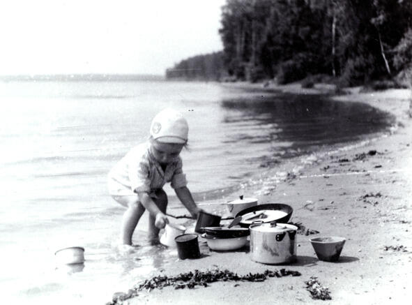 А кто-то в это время уходил на парусном катамаране, а я еще и на «Меве», в дальний поход по озеру на целый день обследовать острова и дальние берега. Частенько у нас в лагере проходили теннисные турниры и для взрослых, и для детей и смешанных пар вели Турнирную таблицу. А недалеко от места большого общего костра была натянута волейбольная сетка там проводили турниры по пляжному волейболу. Команды играют шутки и смех со стороны болельщиков, грызущих семечки потом они меняются местами и шутки еще острее. Рядом с хозяевами их собаки они или внимательно смотрят за игрой, когда хозяин болельщик, или пытаются помогать, путаясь под ногами, если хозяин/хозяйка играет. Настроение поднимало у всех. Мы там жили очень дружно и весело, полноценной жизнью любого курорта. Меньше чем на три недели люди не приезжали. Такая жизнь нас и наших детей закаляла и оздоравливала, поднимала настроение и развивала это был настоящий глоток свежего воздуха и свободы!