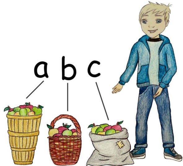 Якщо нам потрібно 5 кошиків яблук, то це можна записати як 5а.