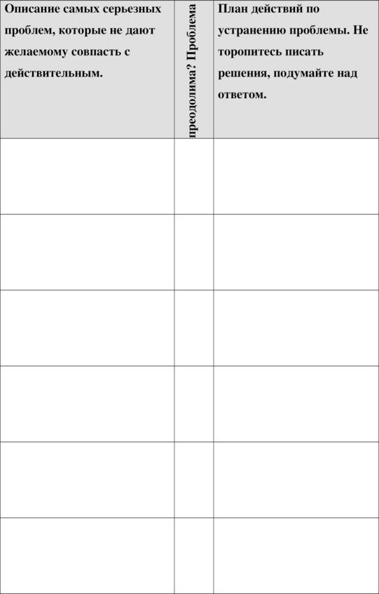 Каждый вопрос и ответ следует соотнести с реальностью и выявить существующие препятствия в реализации вашей мечты, понять насколько ваше желаемое совпадает с окружающей действительностью и вашими возможностями.