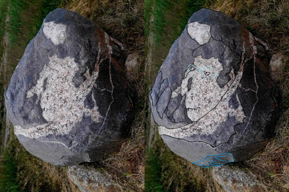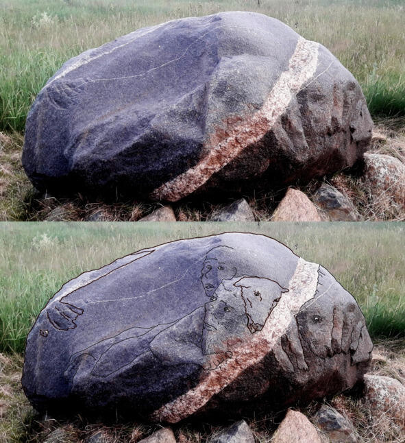Другая сторона камня тоже с тройным стереоэффектом, и здесь мы видим инопланетянина в шлеме. Видно его узкий зрачок, а радужная оболочка глаза очень светлая, как и цвет кожи. Также у него вытянутые ноздри и узкий лоб, как и у исполинов. Его рука в перчатке, но кончик пальца как бы прошёл через стекло и оказался без перчатки. Возможно, так исполин хотел показать, что инопланетяне не могли дышать нашей атмосферой.