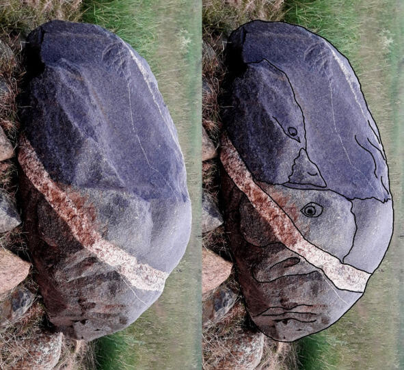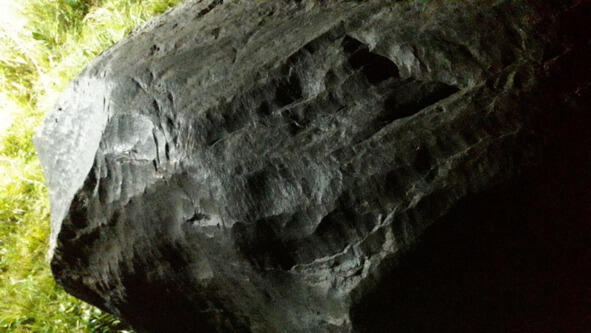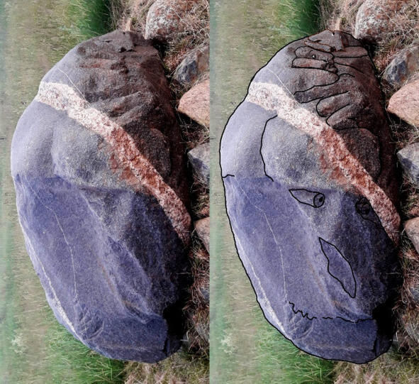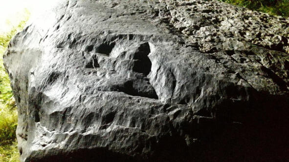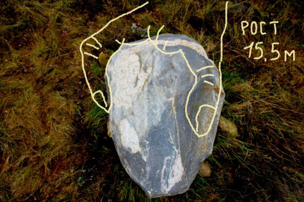 На нём чётко видны углубления под пальцы, что говорит о том, что он тоже служил инструментом, и весит он 5 тонн. Исходя из пропорций руки, рост его хозяина был 15,5м.