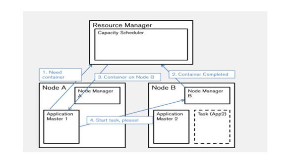 Затем есть Application Master, или мастер приложения, который также работает на одном из серверов, и отвечает за согласование контейнеров с диспетчером ресурсов и менеджерами узлов.