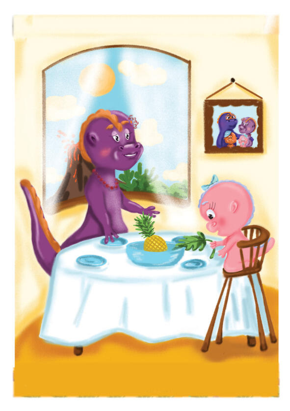 Мама-динозавр, которую звали Фифи, приготовила на ужин салат из листьев пальмы и ананаса и сварила вкусный компот из тропических фруктов. Она постелила новую скатерть, украсила стол свежими цветами и позвала всех членов семьи. Ей очень хотелось, чтобы все дружно собирались за столом.