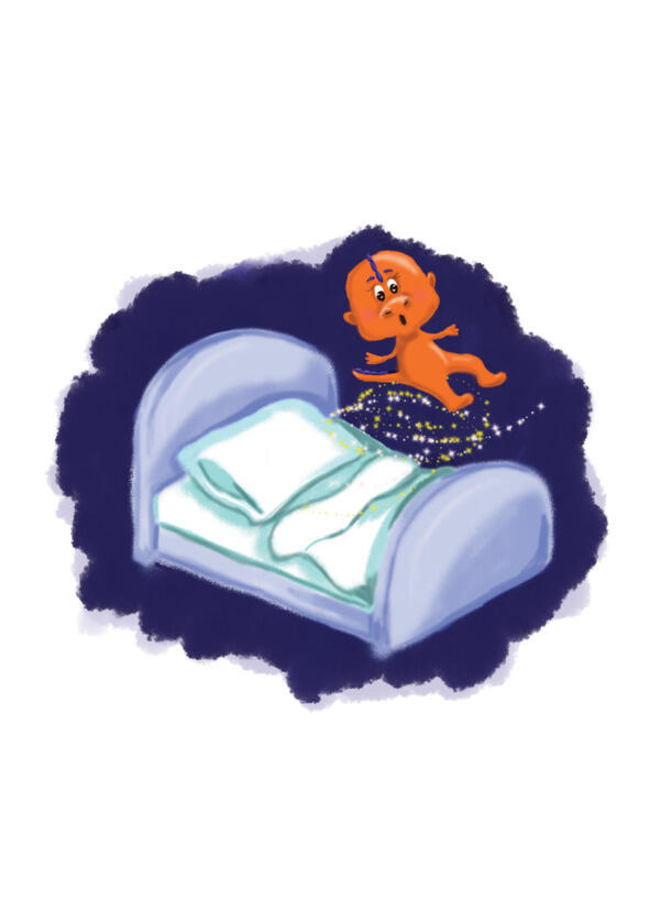 А ночью Кокосику приснился такой сон. Спал он в своей кроватке, как вдруг поток воздуха его подхватил, поднял в воздух и закружил.