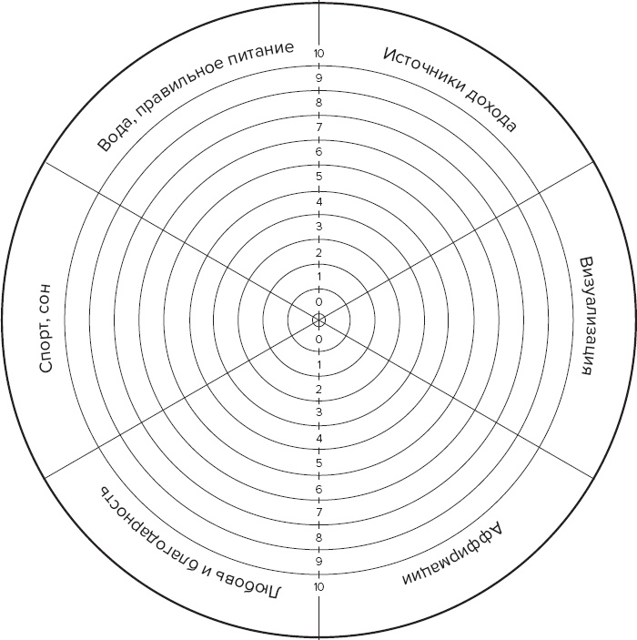 Круг жизненного баланса включает 6 ритуалов духовного, физического и финансового здоровья. Проанализируйте, насколько у вас сейчас реализованы эти ритуалы, и оцените их по шкале от 0 до 10. Изобразите это на шаблоне диаграммы жизненного баланса, закрасив нужное количество делений, либо запишите оценку цифрой.