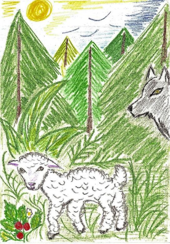 Олечка оставила на блюдце недоеденную булочку и помчалась во двор. К её удивлению, там уже был Антошка. Увидев Олю, барашек опять жалобно заблеял. И тут неожиданно для себя Оля его поняла! Нельзя сказать, что барашек заговорил человеческим голосом. Вовсе нет! Просто теперь, слыша блеянье, она стала понимать его смысл! Барашек хотел домой! Вот как просто! И, как будто почувствовав, что его понимают, барашек рассказал, что он живёт с родителями в деревне на другом конце леса. Мама строгонастрого запрещала ему уходить далеко от дома. А ему так хотелось посмотреть мир. И вот сегодня утром, когда они вышли гулять, он незаметно убежал в лес. Как всё интересно было там: и большие деревья, и густые папоротники! А какая там была красивая брусника! И вдруг он увидел какуюто тень позади в кустах. Оглянулся на него смотрели злые жёлтые глаза! Волк! Бедный маленький барашек помчался, не разбирая дороги, пока не оказался в этом дворе. Как найти теперь свой дом? Как не встретить этого злющего и вечно голодного волка?