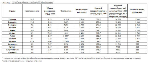 Информация по нашим ближайшим соседям содержится в нижеприведенной таблице. Для удобства восприятия информации товарооборот аптек я пересчитал в рубли (на базе среднего курса рубля за 2017 год по отношению к евро), а затем вывел среднемесячный показатель (простым делением на 12):