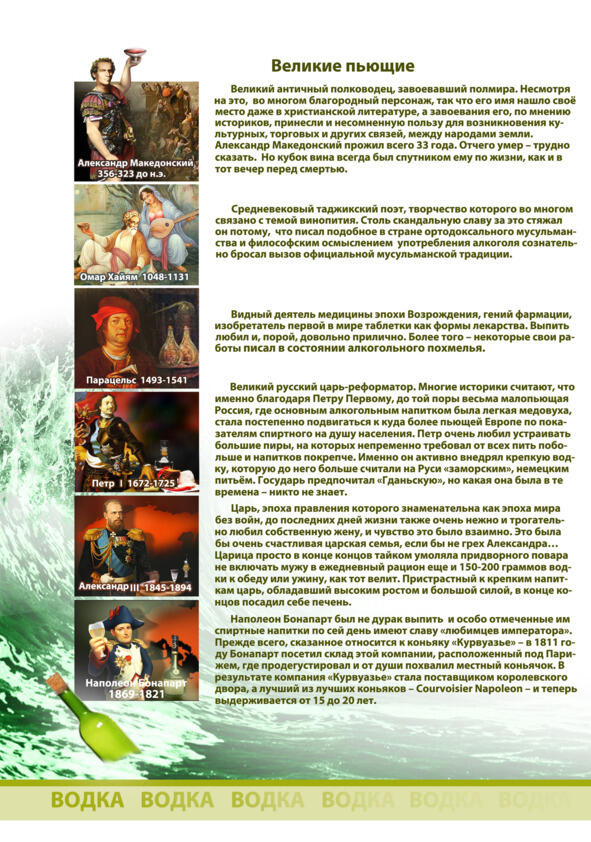 Великий русский царь-реформатор. Многие историки считают, что именно благодаря Петру Первому до той поры весьма мало пьющая Россия, где основным алкогольным напитком была легкая медовуха, стала постепенно подвигаться к куда более пьющей Европе по показателям спиртного на душу населения. Петр очень любил устраивать большие пиры, на которых непременно требовал от всех пить побольше и напитков покрепче. Именно он активно внедрял крепкую водку, которую до него больше считали на Руси «заморским», немецким питьём. Государь предпочитал «Гданьскую», но какая она была в те времена никто не знает.