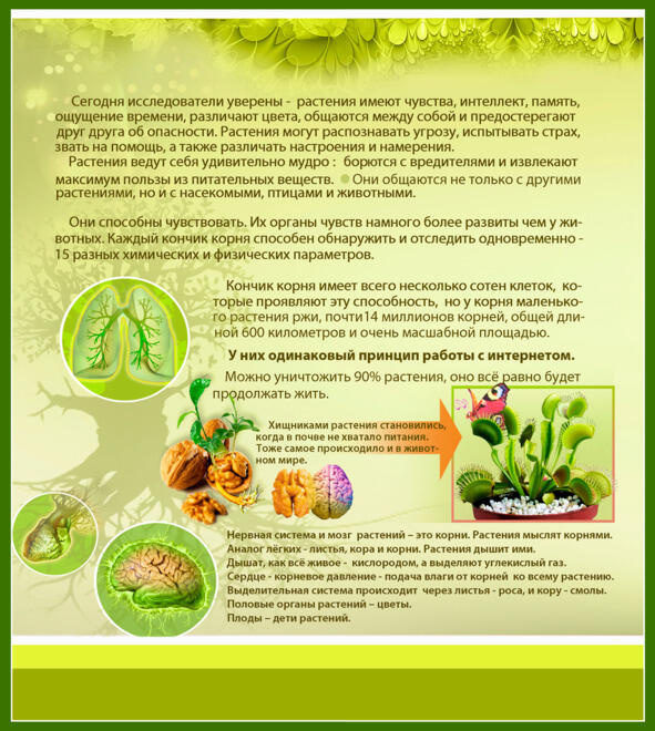 Они способны чувствовать. Их органы чувств развиты намного более, чем у животных. Каждый кончик корня способен обнаружить и отследить одновременно 15 различных химических и физических параметров.