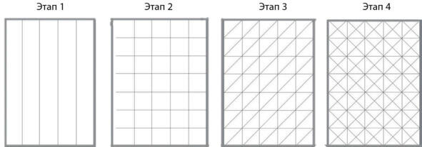 Этап 2. Возьмите карандаш тремя пальцами (большим, указательным и безымянным) сверху, проведите в ритмичном движении несколько горизонтальных линий на расстоянии 34 см друг от друга. При пересечении вертикальных и горизонтальных линий у вас должны получиться квадратики примерно одинакового размера.