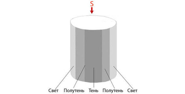 Форма распределения светотени на разных поверхностях разная. На цилиндре светотеневые градации располагаются вертикальными полосами при вертикальном положении цилиндра, на конусе треугольниками, на шаре дугами.